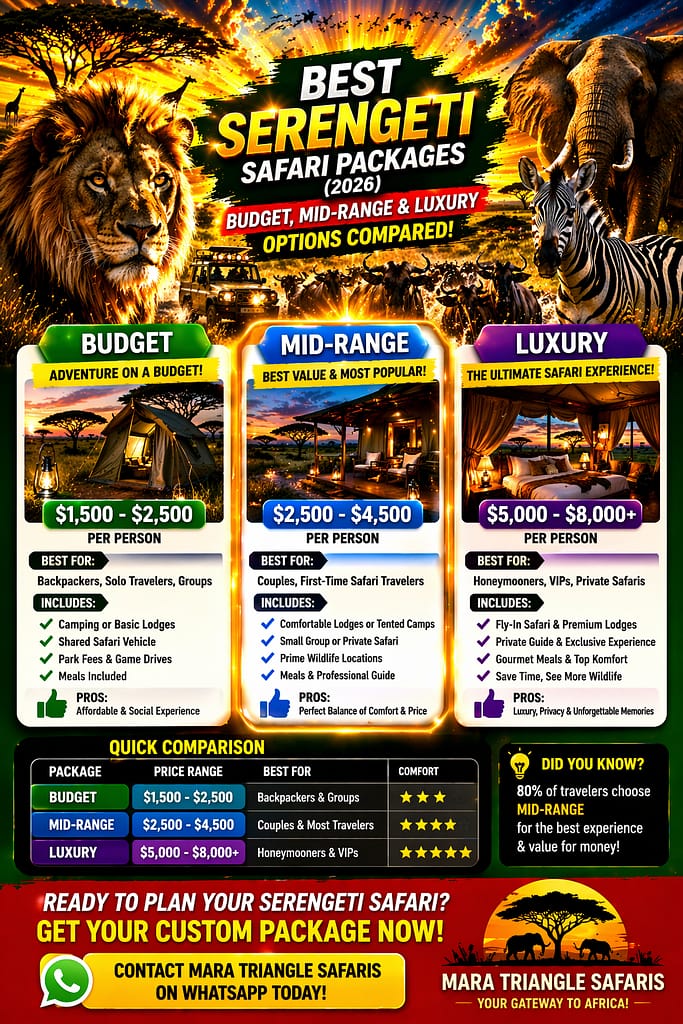 Best Serengeti safari packages 2026: budget, mid-range & luxury. Real prices, inclusions & tips. Get your custom quote from Mara Triangle Safaris.