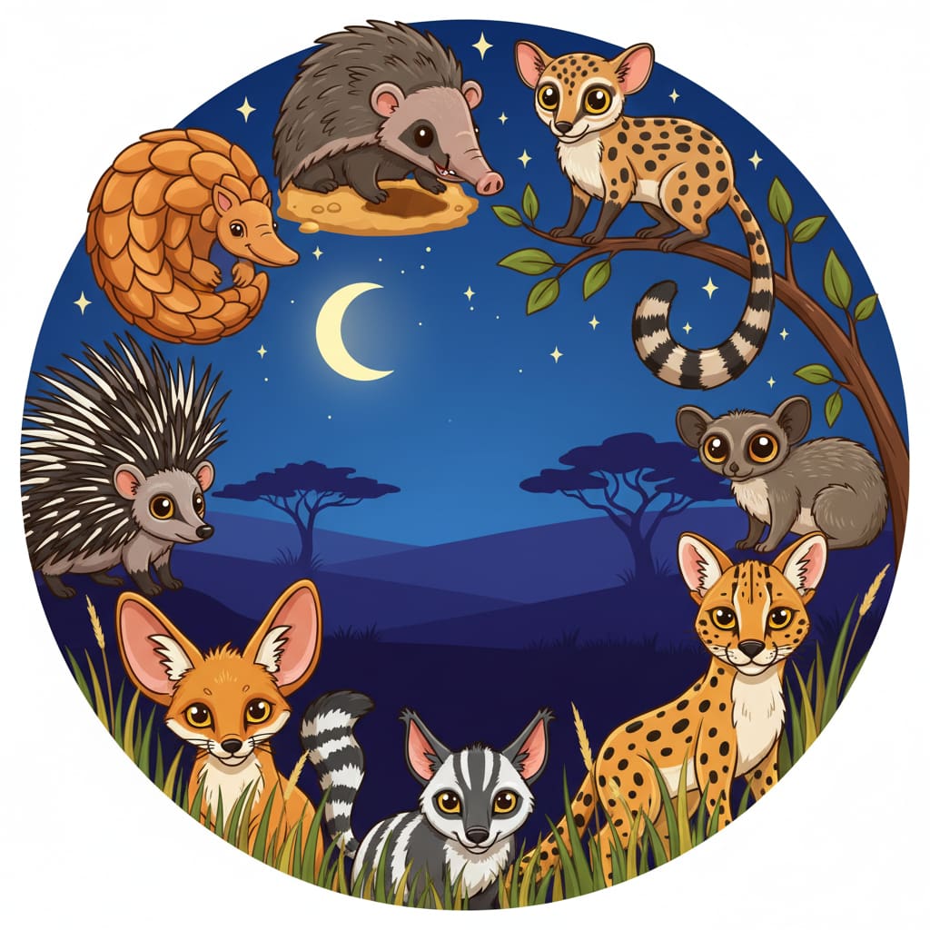 | Nocturnal | Active at night, sleeps during the day | Pangolin, aardvark, bushbaby, genet, civet, porcupine, zorilla |